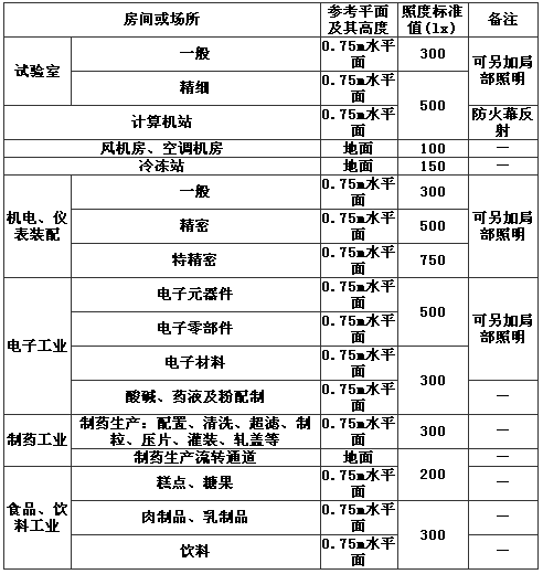 9.2.3 本條中的無采光窗潔凈室(區(qū))是指在建筑物的圍護(hù)結(jié)構(gòu)上不設(shè)置窗,或有窗而被全部遮擋,或窗面積很小起不到采光窗作用的潔凈廠房。參照現(xiàn)行國家標(biāo)準(zhǔn)《建筑照明設(shè)計(jì)標(biāo)準(zhǔn)》GB 50034-2004中的有關(guān)規(guī)定對本條進(jìn)行了修改,表11是摘錄該標(biāo)準(zhǔn)的部分相關(guān)內(nèi)容。