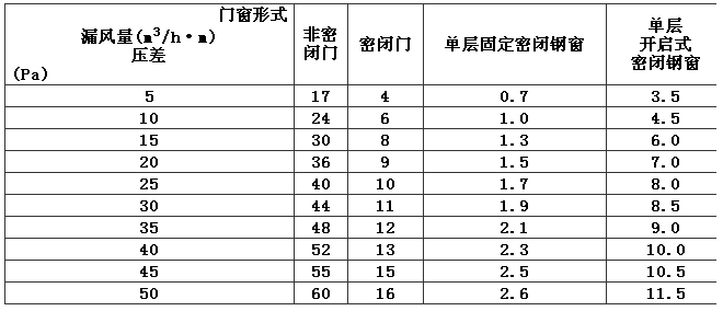 單位長度縫隙滲漏空氣量用公式計算是比較困難的,一般是通過不同形式的門、窗進(jìn)行多次試驗的數(shù)據(jù)統(tǒng)計后得出的。表7是對國內(nèi)潔凈室的20多種常用的門、窗在實驗室進(jìn)行了大量的試驗后取得的數(shù)據(jù),雖然近年來潔凈室門窗的材料和形式有很大的發(fā)展,但目前還有部分潔凈室仍然采用鋼制密封門窗,故表7中的數(shù)據(jù)仍可供設(shè)計時參考。