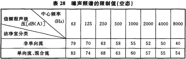 14.1.4 電子工業(yè)潔凈室(區(qū))的噪聲頻譜限制值,應采用倍頻程聲壓級,各頻帶聲壓級不宜大于現(xiàn)行國家標準《潔凈廠房設計規(guī)范》GB 50073-2001的規(guī)定,現(xiàn)將該規(guī)范的相關規(guī)定摘錄在表28中。