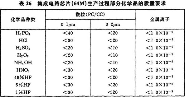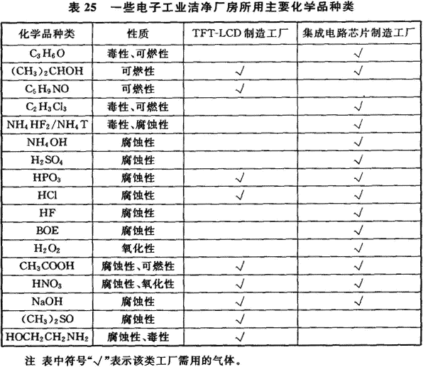 11.1.1 電子工業(yè)潔凈廠房常常需使用各種化學品,根據(jù)電子產(chǎn)品品種及其生產(chǎn)工藝的不同,各種電子產(chǎn)品生產(chǎn)所使用的化學品是不相同的,其中以集成電路芯片制造過程、TFT—LCD生產(chǎn)過程所需的化學品品種多,有的純度要求嚴格,表25是這兩種電子產(chǎn)品生產(chǎn)用潔凈廠房內(nèi)所用的主要化學品種類。表26是有關(guān)資料提出的集成電路芯片64M生產(chǎn)過程部分化學品的質(zhì)量要求。