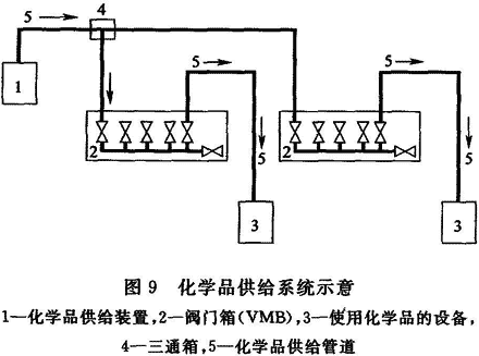 11.3.3 對一些使用多種化學品的管道供應系統(tǒng)的國內(nèi)電子工業(yè)潔凈廠房的調(diào)查和相關(guān)的技術(shù)資料介紹表明,為確?;瘜W品供應輸送系統(tǒng)的安全和有利于連接多臺生產(chǎn)設(shè)備共用一條管路系統(tǒng),一般在液體化學品供應系統(tǒng)中設(shè)有化學品供應分配閥箱(Valve Manifold Box,簡稱VMB,如圖9所示)。故作本規(guī)定。