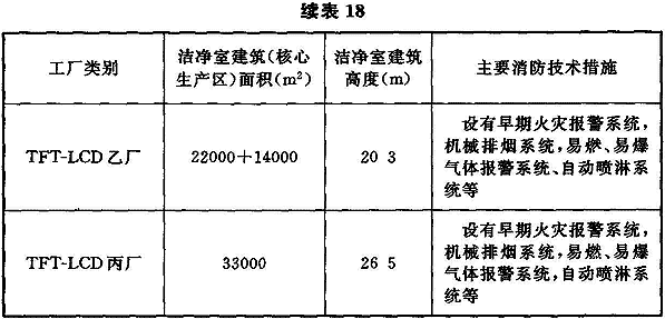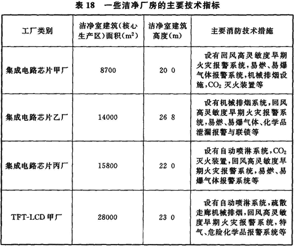 6.2.3 從20世紀(jì)90年代末以來,我國建設(shè)了一批大規(guī)模集成電路芯片生產(chǎn)用潔凈廠房、TFT-LCD生產(chǎn)用潔凈廠房,它們的潔凈室面積和防火分區(qū)面積均大大超過現(xiàn)行國家標(biāo)準(zhǔn)《潔凈廠房設(shè)計(jì)規(guī)范》GB 50073、《建筑設(shè)計(jì)防火規(guī)范》GB 50016規(guī)定的面積。這些芯片制造、TFT-LCD制造為代表的高科技潔凈廠房具有大面積、大體量的特點(diǎn),如表18所列的國內(nèi)8″~12″芯片生產(chǎn)潔凈廠房潔凈區(qū)面積從6500m216000m2,第五、六代TFT-LCD生產(chǎn)用潔凈區(qū)已達(dá)36000m2,第八代TFT-LCD已達(dá)90000m2。這類潔凈廠房通常由潔凈生產(chǎn)區(qū)和潔凈生產(chǎn)區(qū)各自設(shè)有的上下技術(shù)夾層構(gòu)成,廠房高度約為20~30m。由于芯片制造、TFT-LCD制造的生產(chǎn)工藝設(shè)備體量大,制造過程的連續(xù)性和自動(dòng)化傳輸,所以生產(chǎn)工藝區(qū)是不能分隔的。為加強(qiáng)消防技術(shù)措施,在美國消防標(biāo)準(zhǔn)NFPA 318((潔凈室消防標(biāo)準(zhǔn)》中要求采用高靈敏(≤0.01%obs/m)早期空氣取樣式煙霧探測系統(tǒng),在環(huán)境空氣中煙霧濃度很低的火情出現(xiàn)初期,探測系統(tǒng)即發(fā)出警報(bào),相應(yīng)消防應(yīng)急系統(tǒng)即可啟動(dòng)將火情消滅在初始階段;據(jù)了解,國內(nèi)外的此類高科技潔凈廠房都這樣設(shè)計(jì)建造,投產(chǎn)最早的已有十年以上。