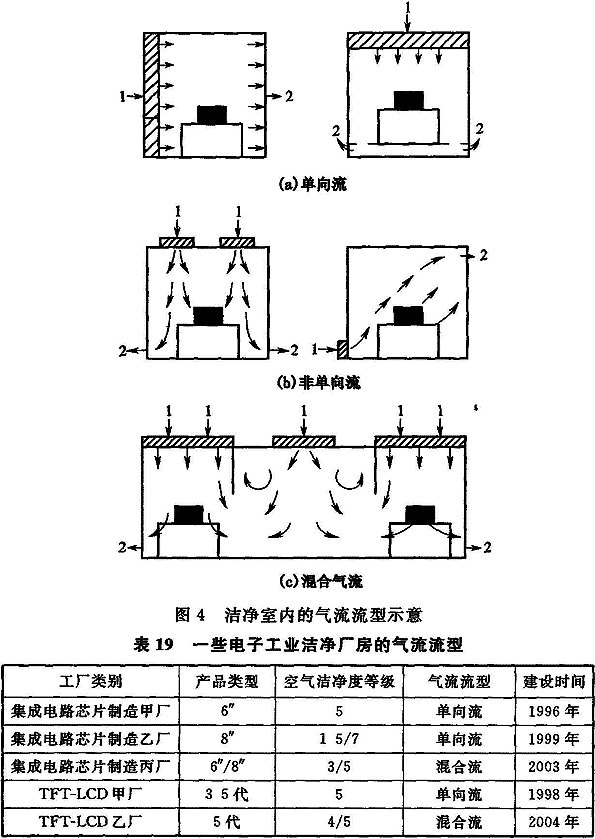 本條推薦的潔凈室(區(qū))內(nèi)氣流流型的設(shè)計(jì)要求,是基于數(shù)十年電子工廠潔凈廠房工作實(shí)踐的經(jīng)驗(yàn)總結(jié),并結(jié)合國際標(biāo)準(zhǔn)化組織ISO/TC 209技術(shù)委員會已經(jīng)頒布、實(shí)施的《潔凈室及相關(guān)受控環(huán)境標(biāo)準(zhǔn)》IS0 14644—1、IS0 14644-4中有關(guān)氣流流型的要求和近年來國內(nèi)建成投產(chǎn)的電子工業(yè)潔凈廠房所采用的氣流流型的實(shí)際狀況制定的。圖4是IS0 14644-4中對潔凈室氣流流型的圖示。表19是一些電子工業(yè)潔凈廠房的氣流流型。上述情況表明:空氣潔凈度等級為1~5級時(shí),基本上采用單向流或混合流,空氣潔凈度等級為6~9級時(shí),基本上采用非單向流,且混合流流型可應(yīng)用于所有各種空氣潔凈度等級的潔凈室。
