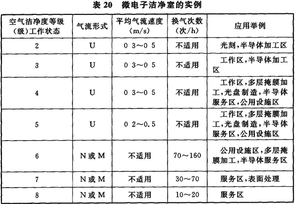 1 表20是根據(jù)國際標(biāo)準(zhǔn)化組織ISO/TC 209技術(shù)委員會編寫、發(fā)布的《潔凈室及相關(guān)受控環(huán)境標(biāo)準(zhǔn)》ISO 14644—4《潔凈室的設(shè)計(jì)、建造和試運(yùn)行》中的表B.2微電子潔凈室的實(shí)例,列出了空氣潔凈度等級為2~8級的氣流流型、潔凈送風(fēng)量的數(shù)據(jù)。