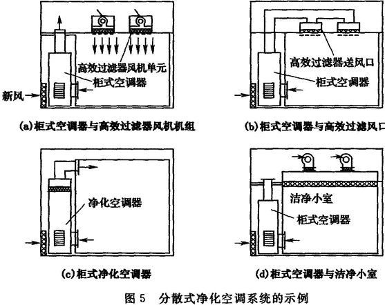7.3.1 電子工業(yè)潔凈廠房中的凈化空調(diào)系統(tǒng)的主要形式為集中式和分散式,圖5是幾種分散式凈化空調(diào)系統(tǒng)的典型圖示。從圖中可見,各種形式各具特點(diǎn)和適用性,在實(shí)際應(yīng)用中,應(yīng)根據(jù)具體工程項(xiàng)目的潔凈室規(guī)模、空氣潔凈度等級和電子產(chǎn)品生產(chǎn)工藝特點(diǎn)及其要求確定,同時(shí)考慮運(yùn)行經(jīng)濟(jì)和降低能量消耗。