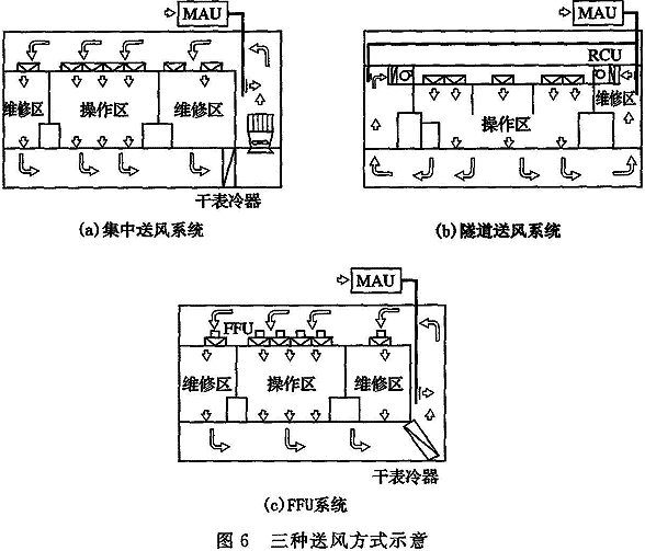 7.3.2 電子工業(yè)潔凈廠房,尤其在規(guī)模較大的集成電路芯片生產(chǎn)和TFT-LCD生產(chǎn)用潔凈廠房的送風(fēng)方式有集中送風(fēng)、隧道送風(fēng)和風(fēng)機(jī)過濾機(jī)組送風(fēng)等類型,各種送風(fēng)方式各具特點(diǎn)和適用性,圖6是各種送風(fēng)方式的示意圖。圖6中:(a)集中送風(fēng)系統(tǒng)(CentralSystem),室外新風(fēng)經(jīng)新風(fēng)處理裝置(MAU)后,與經(jīng)表冷器降溫和風(fēng)機(jī)增壓后的回風(fēng)混合,通過高效過濾器送至潔凈生產(chǎn)層。(b)隧道送風(fēng)系統(tǒng)(Tunnel System),潔凈區(qū)的回風(fēng)經(jīng)維修區(qū)與新風(fēng)處理(MAU)后的新風(fēng)混合后,由循環(huán)空氣處理裝置送入送風(fēng)靜壓箱,通過空氣過濾器送入潔凈區(qū)。(c)FFU系統(tǒng),潔凈區(qū)回風(fēng)經(jīng)表冷器降溫后與處理后新風(fēng)混合,通過FFU增壓、過濾送入潔凈區(qū)。三個系統(tǒng)各有利弊,其選擇主要與電子產(chǎn)品生產(chǎn)工藝、能量消耗、建設(shè)投資等有關(guān),有時(shí)也與業(yè)主的意愿有關(guān),但近年來在集成電路潔凈廠房中,采用FFU系統(tǒng)者日益增多。