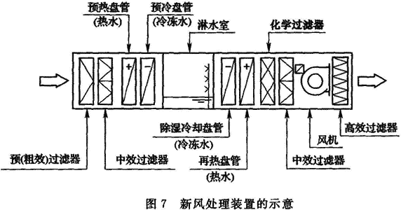 3 有利于強(qiáng)化對室外新風(fēng)的處理,在微電子、光電子用潔凈室的送風(fēng)中,不僅要求控制微粒、溫度、相對濕度等,還要求去除影響產(chǎn)品質(zhì)量或降低成品率的分子態(tài)化學(xué)污染物,如Na、SOx、NOx、Cl、B等,這些污染物主要來自室外大氣中。為此,對于此類潔凈廠房需對室外吸入新鮮空氣進(jìn)行嚴(yán)格處理,常??梢圆捎昧芩ㄈコ髿庵械腟Ox、NOx和Cl;采用化學(xué)過濾器和活性炭過濾器,利用物理吸附和化學(xué)吸附的原理,將低濃度的分子態(tài)化學(xué)污染物去除到規(guī)定的濃度要求。圖7是某微電子工業(yè)潔凈廠房的新風(fēng)處理裝置示意圖,采用了11個功能段——兩級加熱、兩級表冷、兩級淋水、四級過濾和一級加濕。