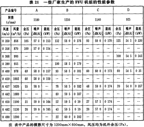 7.4.2 風(fēng)機(jī)過濾機(jī)組(FFU)是將風(fēng)機(jī)與高效過濾器(HEPA)或超高效過濾器(ULPA)組合在一起,構(gòu)成自身可提供推動力的末端空氣凈化裝置。它由風(fēng)機(jī)、過濾器、機(jī)殼和電器控制等部分組成。FFU的主要技術(shù)性能包括風(fēng)量(一般以斷面風(fēng)速表示)、余壓、能耗、效率、噪聲和控制方式等。目前國內(nèi)電子工業(yè)潔凈室應(yīng)用FFU越來越多,不僅在大面積、空氣潔凈度要求嚴(yán)格的單向流或混合流潔凈室(區(qū))采用,而且在各種用途的、面積不是很大的單向流或混合流潔凈室(區(qū))中也有應(yīng)用。目前在應(yīng)用中受到各方面關(guān)注的主要是FFU裝置的經(jīng)濟(jì)性(投資、運(yùn)行費(fèi))、風(fēng)量和余壓、噪聲、能耗等性能參數(shù),表21是對國內(nèi)市場的幾個制造廠家生產(chǎn)的FFU裝置的實(shí)測性能參數(shù)。