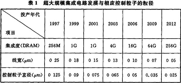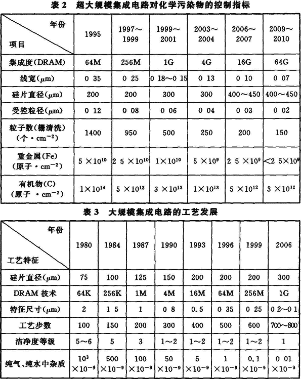 3.1.1~3.1.3 隨著科學技術的發(fā)展,電子產品生產日新月異,以微電子產品為代表的各種電子產品生產技術發(fā)展迅速?,F(xiàn)代電子產品要求微型化、精密化、高純度、高質量和高可靠性,以人們熟悉的手機、筆記本電腦為例,它所使用的集成電路、電子元器件以及其組裝的生產過程都要求在受控環(huán)境條件下進行操作,其中以集成電路生產過程對受控環(huán)境的要求尤為嚴格,當今線寬為45nm的超大規(guī)模集成電路產品已投入生產,其受控生產環(huán)境——潔凈室(區(qū))的受控粒子尺寸要求小于0.02μm甚至更小。表1是超大規(guī)模集成電路的發(fā)展及相應控制粒子的粒徑。集成電路產品的生產和研究表明,超大規(guī)模集成電路生產所需受控環(huán)境不僅嚴格控制微粒,而且還需嚴格控制生產環(huán)境的化學污染物和直接與產品生產過程接觸的各種介質——高純水、高純氣體、化學品的純度和雜質含量,表2是超大規(guī)模集成電路對化學污染物的控制指標。表3是大規(guī)模集成電路的工藝發(fā)展。
