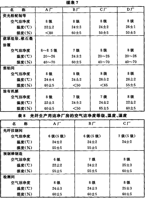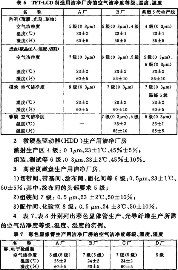 8 等離子顯示器(PDP)生產用潔凈廠房:涂屏間等:5.5級、25±2℃,50%±10%;其他生產間:6.5~8級、20~26℃、55%±10%。