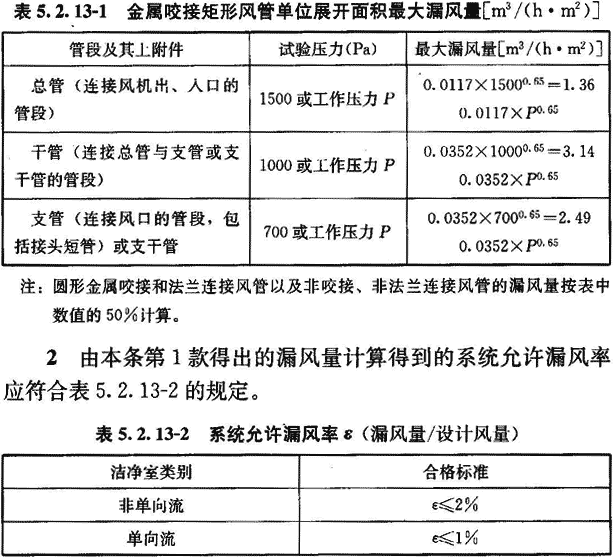 5.2.13 咬接和法蘭連接的金屬風(fēng)管,應(yīng)在膠封縫隙以后和絕熱之前,按附錄A的方法進(jìn)行分段漏風(fēng)檢測(cè)或按現(xiàn)行國(guó)家標(biāo)準(zhǔn)《通風(fēng)與空調(diào)工程施工質(zhì)量驗(yàn)收規(guī)范》GB 50243的方法進(jìn)行干管和主管系統(tǒng)的漏風(fēng)檢測(cè)。1~5級(jí)潔凈度環(huán)境的風(fēng)管應(yīng)全部進(jìn)行漏風(fēng)檢測(cè),6~9級(jí)潔凈度環(huán)境的風(fēng)管應(yīng)對(duì)30%的風(fēng)管并不少于1個(gè)系統(tǒng)進(jìn)行漏風(fēng)檢測(cè)。檢測(cè)結(jié)果應(yīng)同時(shí)符合下列兩項(xiàng)嚴(yán)密性指標(biāo):