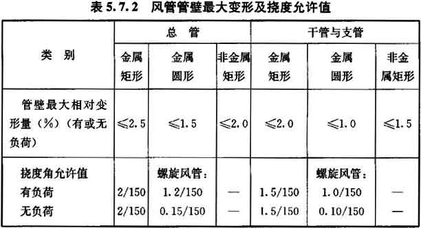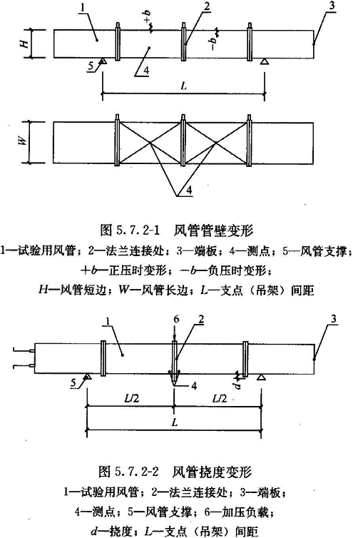 10 外購(gòu)成品風(fēng)管應(yīng)有變形試驗(yàn)。風(fēng)管管壁最大變形相對(duì)量(表面最大不平度b與風(fēng)管短邊長(zhǎng)度H之比,圖5.7.2—1)及撓度角允許值[兩段風(fēng)管組合件中央連接法蘭部位的撓度量d與該兩風(fēng)管組合的兩吊架(支點(diǎn))間距一半L/2之比,見(jiàn)圖5.7.2—2]應(yīng)符合表5.7.2的規(guī)定。