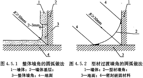 4.5.1 地面與墻面的夾角應(yīng)為曲率半徑只不小于30mm的圓角。當用柔性材料粘貼地面時,在墻面上應(yīng)延伸至地面以上形成圓角并與墻面平齊,或略縮進2mm~3mm,突出的墻面應(yīng)圓滑過渡(圖4.5.1)。需經(jīng)常沖刷的地面,地面材料在墻面上延伸高度應(yīng)大于150mm。