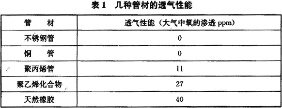 1)對于不同材質(zhì)的管道,其透氣性能不同,如果管材本身透氣性較大,而安裝中不恰當?shù)刈髁诉x用,那么,無論采取任何處理手段去除污染,都將無濟于事。管材透氣性見表1。