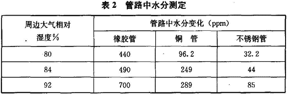 防止大氣中氧的滲透和腐蝕,不銹鋼管和銅管最佳。對700mm長管路中水分的測定,見表2。