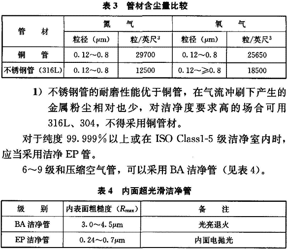 這樣,既防止污染粒子及濕氣在管壁滯留,管材本身在氣流的高速沖刷(擊)下,由于磨阻損耗低,也避免了管材的金屬粉末進入氣流中,造成氣體的污染。不銹鋼管和銅管的不同見表3。