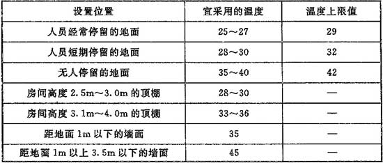 5.7.2 低溫加熱電纜輻射供暖宜采用地板式,低溫電熱膜輻射供暖宜采用頂棚式。輻射體表面平均溫度應(yīng)符合本規(guī)范第5.4.1條的相關(guān)規(guī)定。