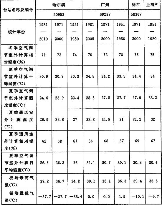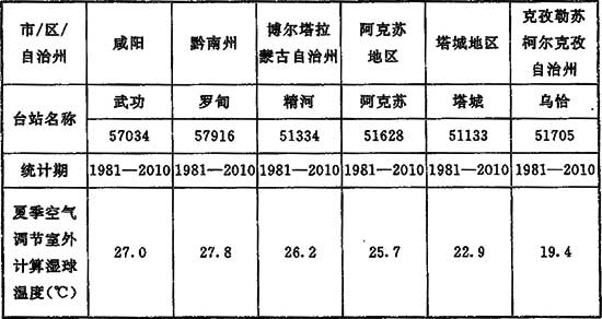 本附錄提供了我國(guó)除香港、澳門(mén)特別行政區(qū),臺(tái)灣外28個(gè)省級(jí)行政區(qū)、4個(gè)直轄市所屬294個(gè)臺(tái)站的室外空氣計(jì)算參數(shù)。由于臺(tái)站遷移、觀測(cè)條件不足等因素,個(gè)別臺(tái)站的基礎(chǔ)數(shù)據(jù)缺失,統(tǒng)計(jì)年限不足30年。統(tǒng)計(jì)年限不足30年的計(jì)算結(jié)果在使用時(shí)應(yīng)參照鄰近臺(tái)站數(shù)據(jù)進(jìn)行比較、修正。咸陽(yáng)、黔南州及新疆塔城地區(qū)等個(gè)別臺(tái)站的濕球溫度無(wú)記錄,可參考表15的數(shù)值選取。