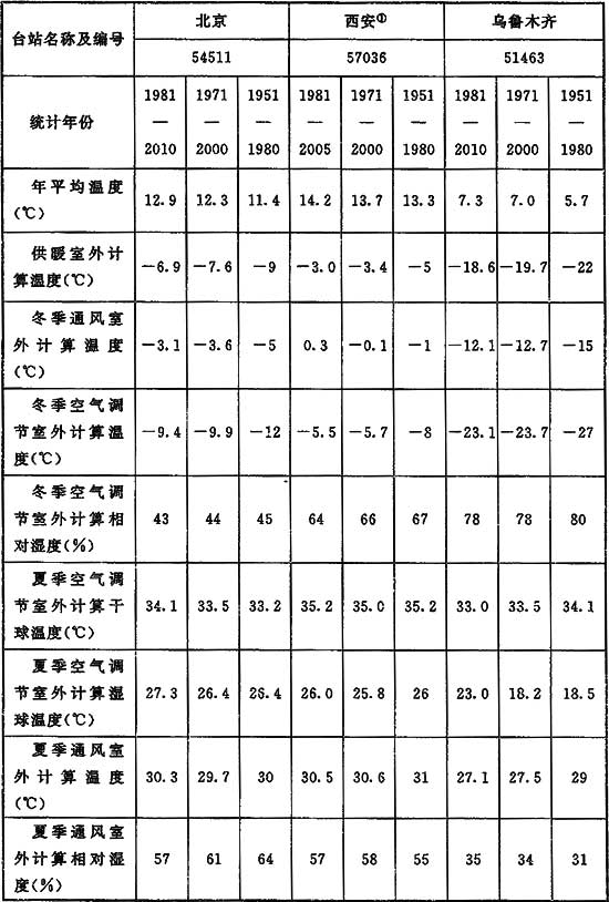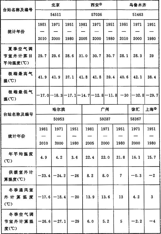 據(jù)氣象學(xué)人士的研究:自20世紀(jì)60年代起,烏魯木齊、青島、廣州等臺(tái)站的年平均氣溫均表現(xiàn)為顯著的上升趨勢(shì),21世紀(jì)前幾年,極端最高氣溫的年際值都比多年平均值偏高。同時(shí),20世紀(jì)60年代中后期和70年代中期是極端低溫事件發(fā)生的高頻時(shí)段,20世紀(jì)70年代初和80年代初是極端高溫事件發(fā)生的低頻時(shí)段,20世紀(jì)90年代后期是極端高溫事件發(fā)生的高頻時(shí)期。因此,室外空氣計(jì)算參數(shù)的結(jié)果也隨之發(fā)生變化。表16可以看出1951-1980年的室外空氣計(jì)算參數(shù)最低,這是由于1951-1980年是極端最低氣溫發(fā)生頻率較高的時(shí)期;1971-2000年由于氣溫逐漸升高,室外空氣氣象參數(shù)也隨之升高,1981-2010年則更高??紤]到近兩年來(lái)冬季氣溫較往年同期有所下降,如果選用1981-2010年的計(jì)算數(shù)據(jù),對(duì)工程設(shè)計(jì)尤其是供暖系統(tǒng)的設(shè)計(jì)影響較大,為使數(shù)據(jù)具有一定的連貫性,編制組在廣泛征求行業(yè)內(nèi)部專(zhuān)家學(xué)者意見(jiàn)的基礎(chǔ)上,最終決定選用1971-2000年作為本標(biāo)準(zhǔn)室外空氣計(jì)算參數(shù)的統(tǒng)計(jì)期,形成表A.0.1(注:即本規(guī)范表A.0.1-1)。
