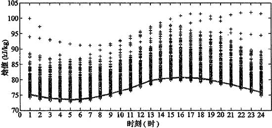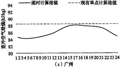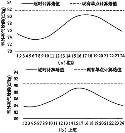 在現(xiàn)有的單點(diǎn)新風(fēng)焓值計(jì)算中,均采用室外空調(diào)計(jì)算干、濕球溫度確定設(shè)計(jì)焓值,即采用累年平均每年不保證50h的干、濕球溫度。編制組認(rèn)為對(duì)于逐時(shí)計(jì)算焓值曲線,其峰值應(yīng)該與觀有不保證50h的濕球溫度對(duì)應(yīng)。通過(guò)對(duì)北京、上海、廣州、哈爾濱、西安、成都等城市的夏季逐時(shí)新風(fēng)計(jì)算焓值的統(tǒng)計(jì),發(fā)現(xiàn)24時(shí)刻分別不保證7小時(shí)的空氣焓值中的最大值,與全年不保證
