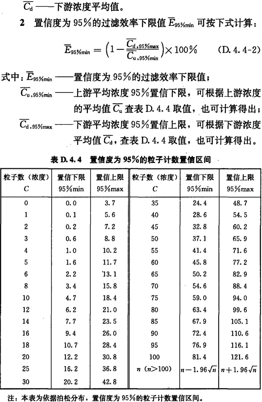2 應根據(jù)上游95%置信下限的粒子濃度Cu,95%min和過濾器最大允許透過率(0.01%),計算下游允許最大濃度,再根據(jù)表D.4.4查得或計算下游允許最大濃度的95%置信下限濃度Cd,95%min