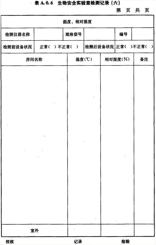 A.0.6 生物安全實(shí)驗(yàn)室房間溫度、相對(duì)濕度的檢測應(yīng)按表A.0.6進(jìn)行記錄。