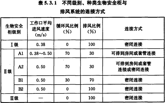 4 不同級別、種類生物安全柜與排風系統(tǒng)的連接方式應按表5.3.1選用。